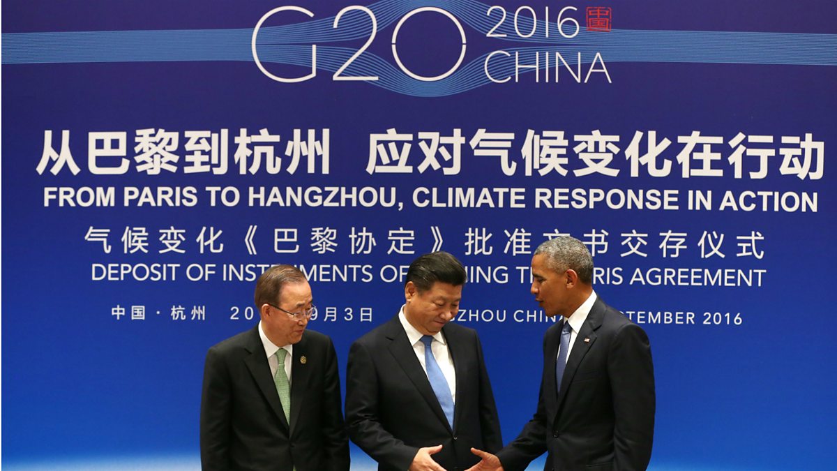 (Chinese President Xi Jinping, US President Barack Obama and UN Secretary General Ban Ki-moon shake hands during a joint ratification of the Paris climate change agreement ceremony ahead of the G20 Summit in Hangzhou on September 3, 2016. Photo credit should read How Hwee Young/AFP/Getty Images)