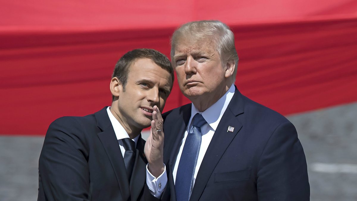 (Photo: French President Emmanuel Macron talks to US President Donald Trump while attending the traditional military parade as part of the Bastille Day celebrations. Credit: EPA/IAN LANGSDON.)