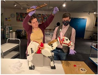 Conservation Manager Gabrielle Flexer and Broadcast Curator Lewis Pollard work out how to attach Muffin the Mule's strings and where it needs extra support