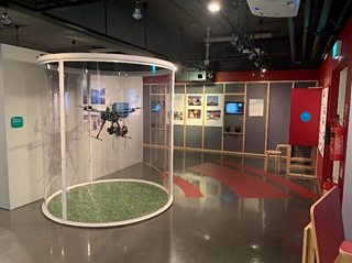The grass base links to the associated footage of its first use by BBC News taking off from a farm in Cheshire in 2013.
