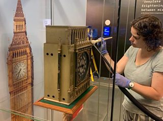 Conservation Manager Gabrielle Flexer cleans intricate details on Little Ben before locking the case. The object was used in BBC studios in the 1950s to replicate Big Ben. The backdrop of Elizabeth Tower contextualises the object