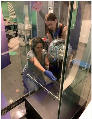 Conservation Manager Gabrielle Flexer and Researcher Tasha Kitcher carefully position the Glitterball Trophy