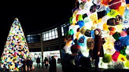 Spanish artists Luzinterruptus chose to highlight the wasteful use of plastic in their Consumerist Christmas Tree, created for the 2013 Lumiere festival in Durham. It was made from about 3000 plastic bags provided by local residents, who were provided with cloth bags in exchange. The bags were then filled with even more plastic – clear packaging material generated by various local shops during the assembly period – and fitted with lights, to provide glow during those late-night shopping hours.