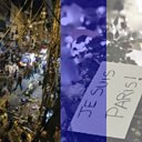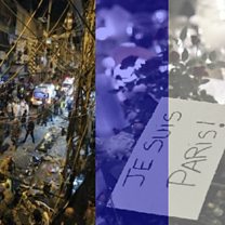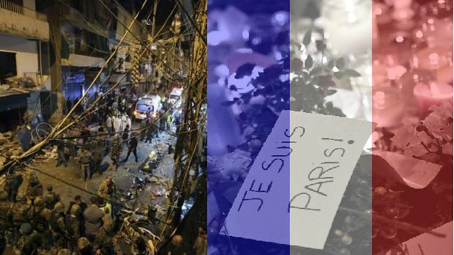 (Photo: Aftermath of suicide bomb in Beirut. Credit Reuters) (Photo: Tributes in Paris seen through the popular French flag filter. Credit: FRANCK FIFE/AFP/Getty)