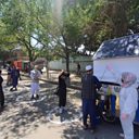 (Photo: An Afghan woman with her mobile disinfectant unit Credit: Farhad Wajdee/ Ebtakar)