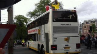Ajax goalkeeper Maarten Stekelenberg drops the Eredivisie trophy during the club's parade through the streets of Amsterdam to celebrate winning the Dutch title.